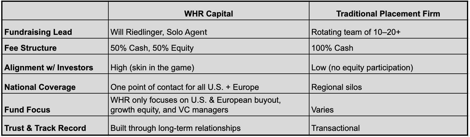 A typical firm raising $200M might charge 2% and the standard placement fee is payable over two years. This means 50% of the LPs management fees go to the placement agent for the first two years of the investment period, at a time when GPs really need those fees to grow junior staff, field back-office operations, and have senior partners pay themselves a salary. WHR Capital runs a different fee stream.